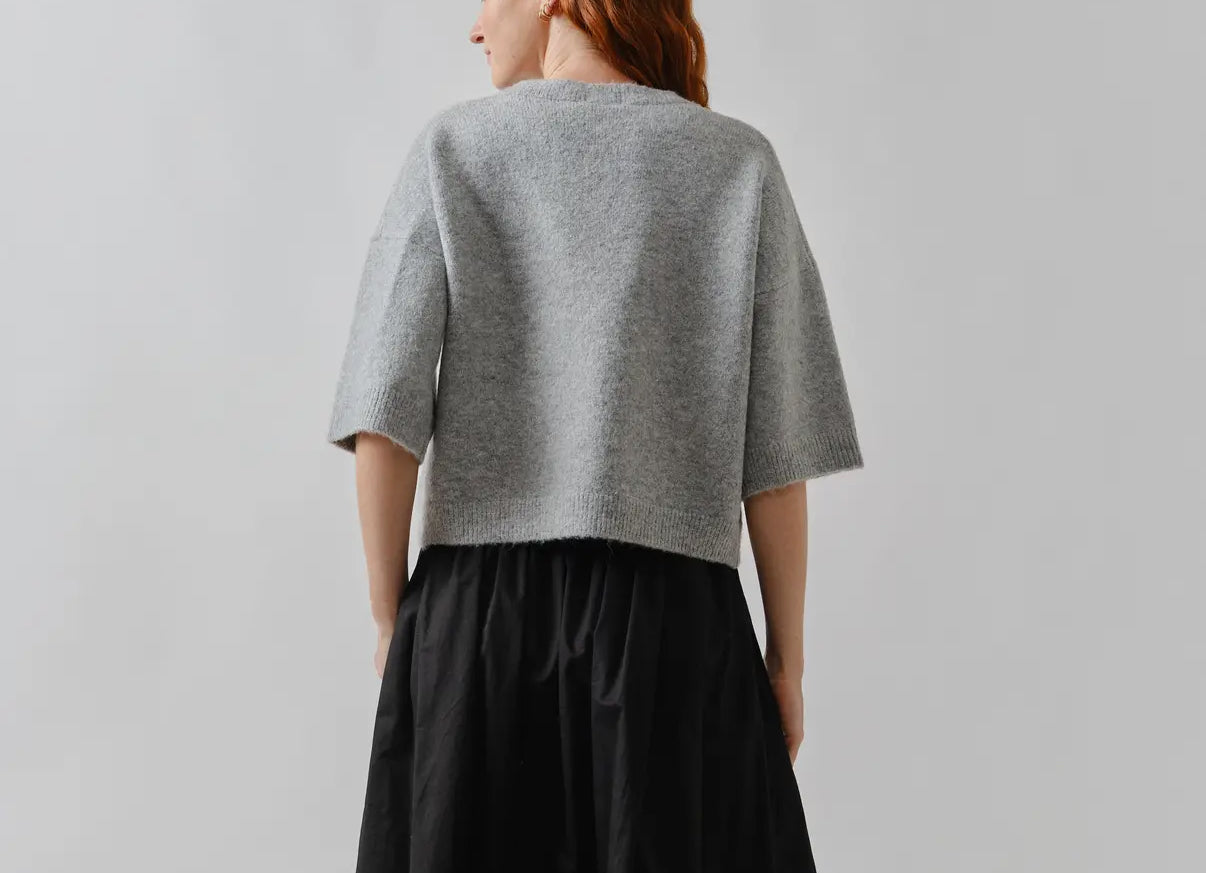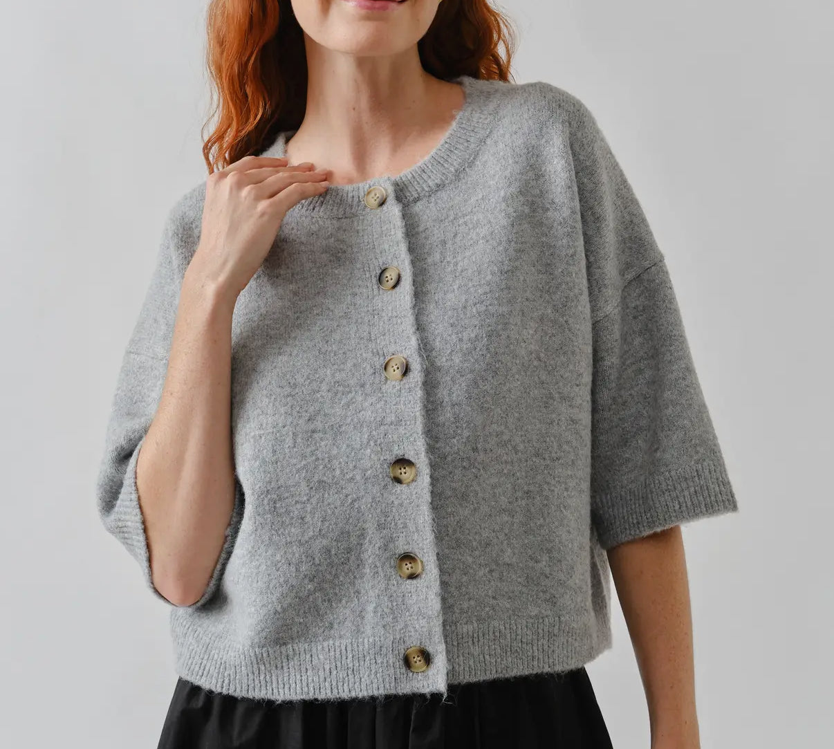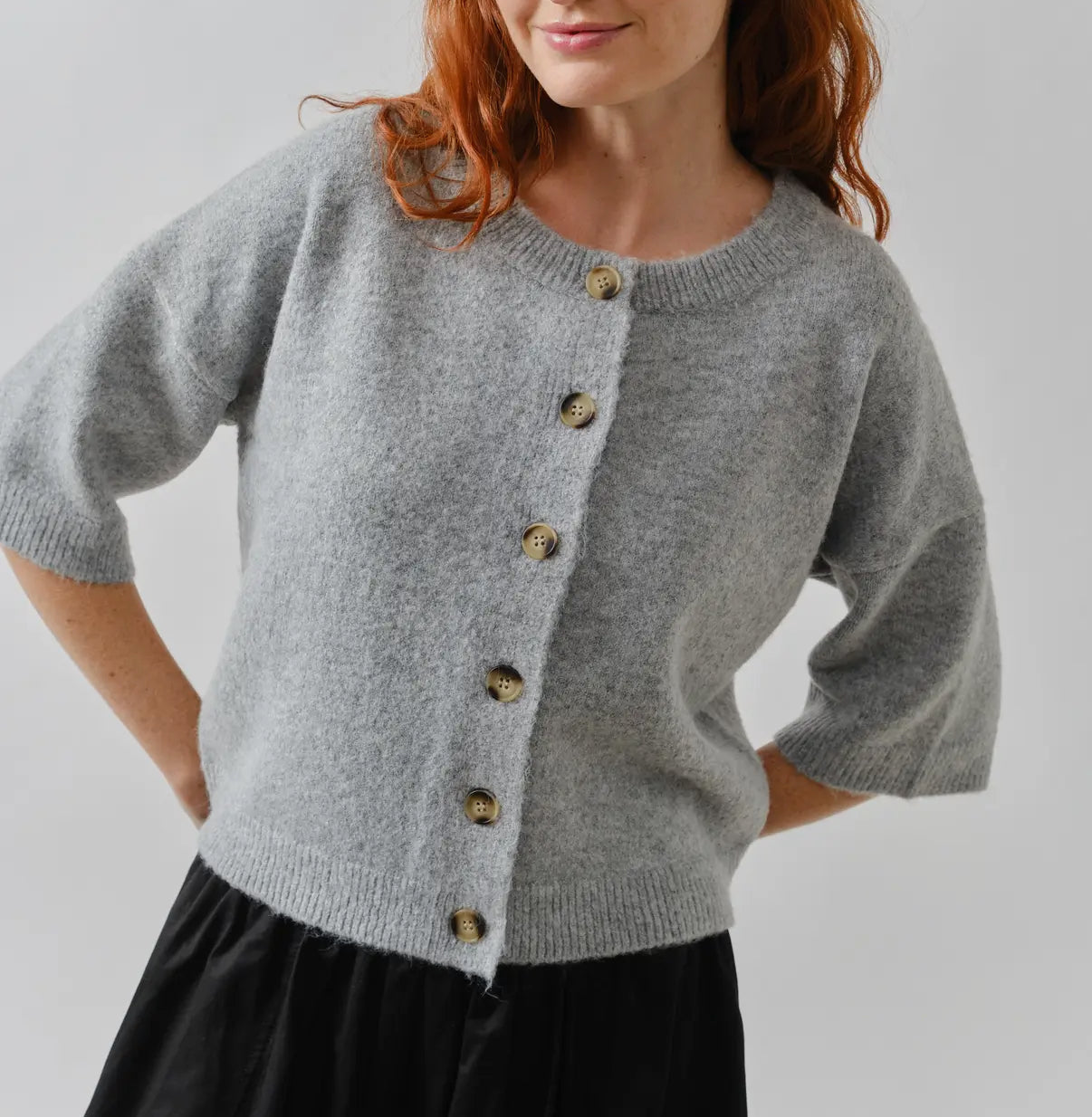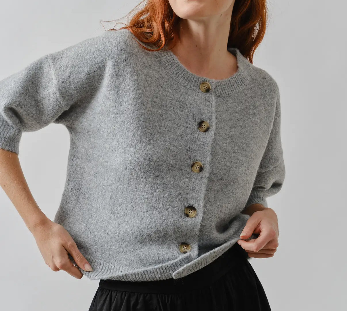 A button down top or cardigan, this seasons trending style because it’s so versatile. A soft knit fabric blend with a ribbed neckline with a three quarter sleeve.