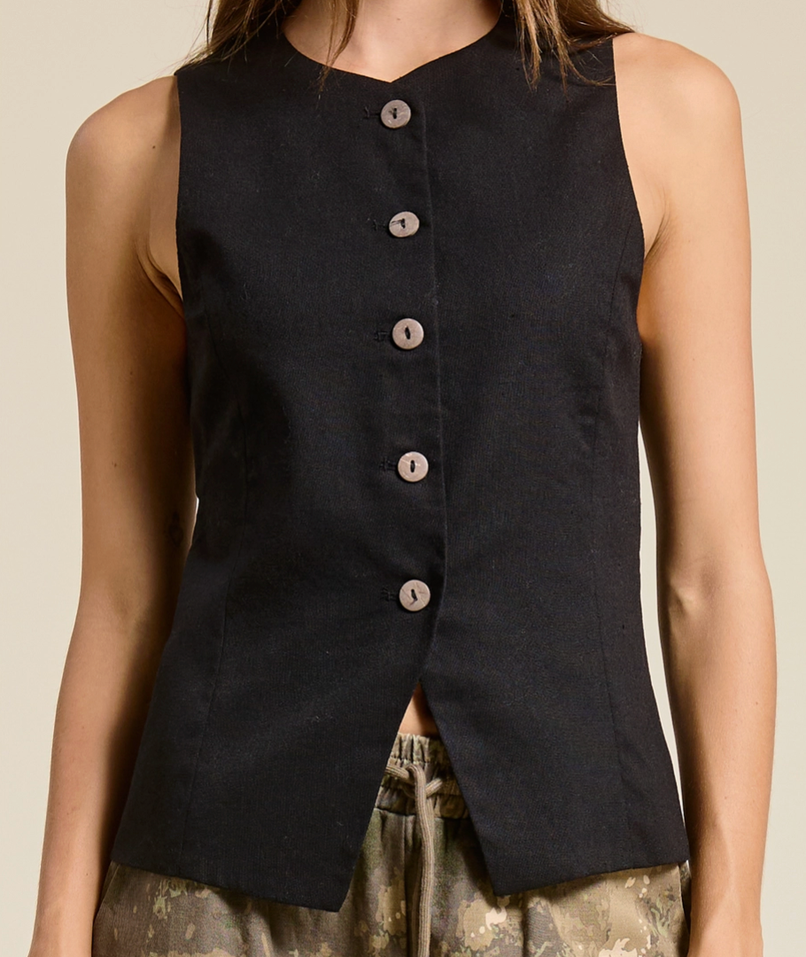 A super chic waistband vest with a round neckline and functioning wooden buttons with a split front feature.