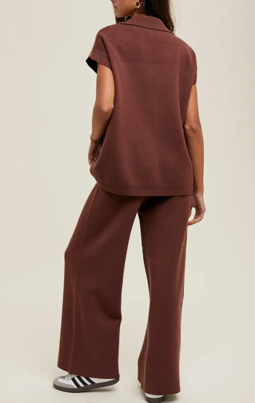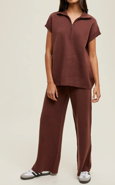 If there was ever a perfect brown lounge set, this would be it! Featuring a relaxed 1/2 zip collar and capped sleeves with an elastic waistline pant. So effortless and cozy. Set is sold together.