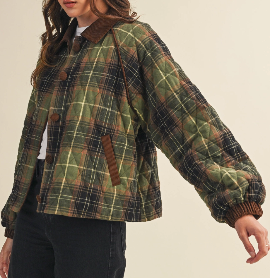 An incredibly amazing plaid corduroy jacket, puff sleeves, functional corduroy buttons, pockets, and it’s lined