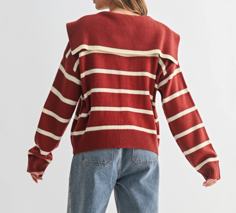 A striped sailor like collared cardigan in a beautiful rust red color and a light weight knit material.