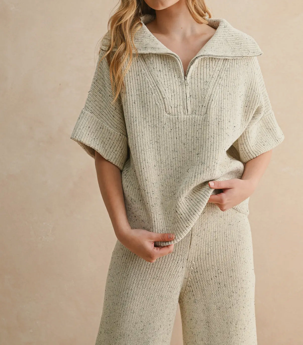 A capsule piece your wardrobe is longing for! A half zip short sleeve knitted top and bottom with an elastic waistband. A perfect two for one fit!