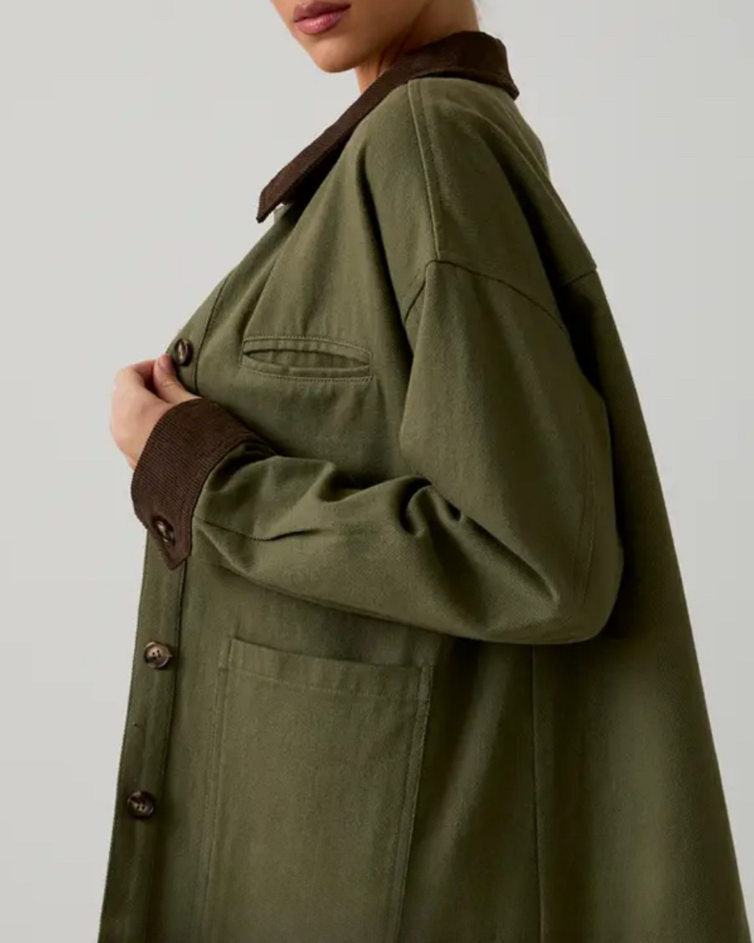 100% cotton denim like barn jacket with a brown suede collar detail. This seasons trending jacket is all the rage. Pair it with your everyday looks for the perfect fall fit.