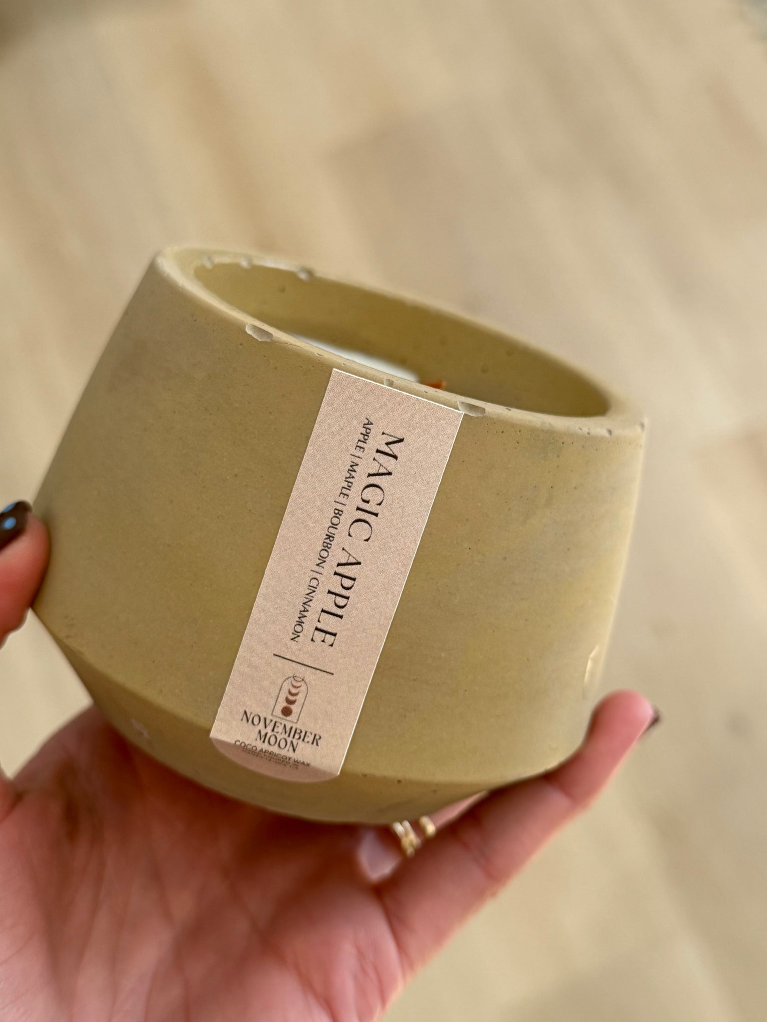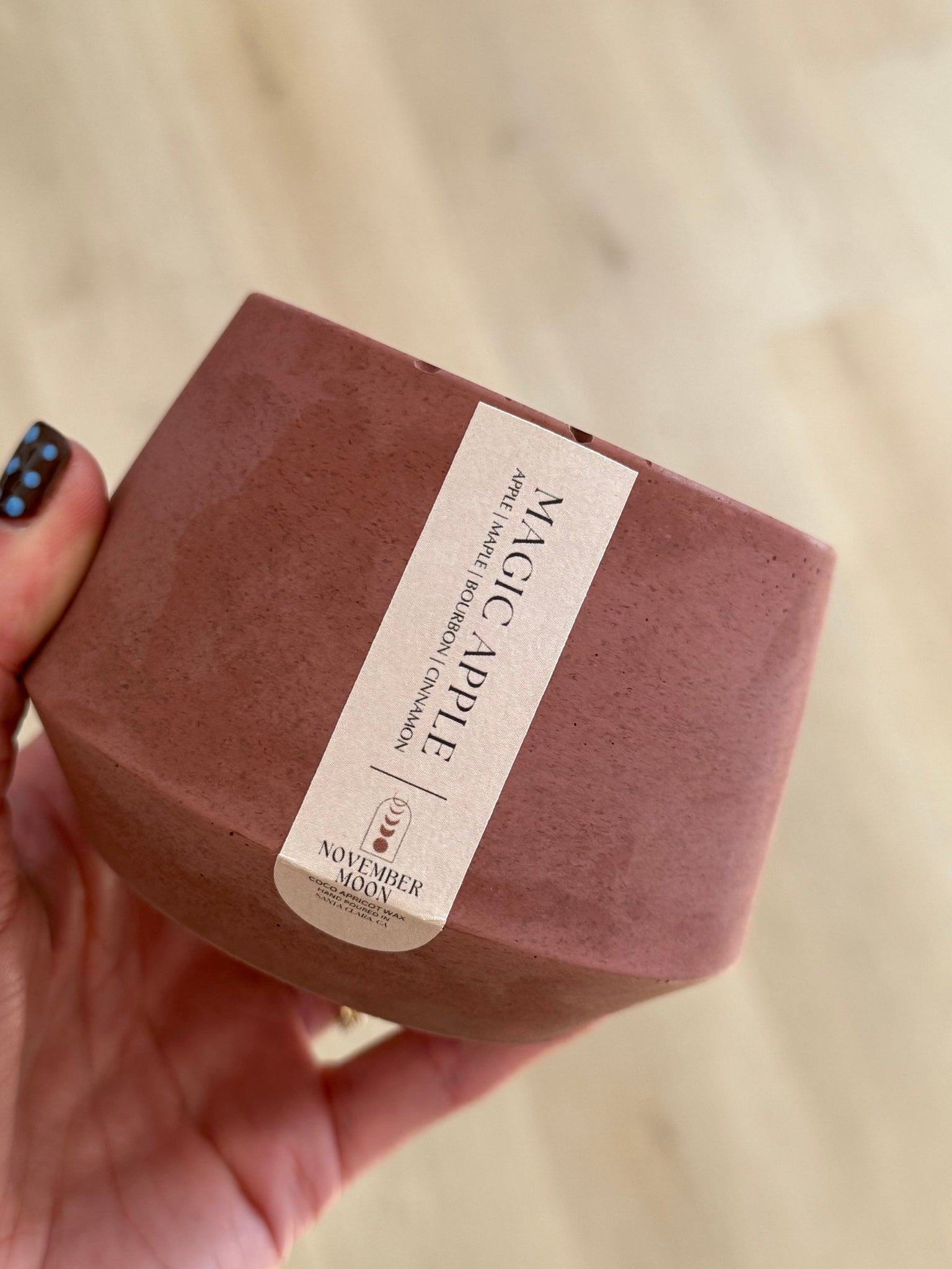 A handmade vessel and NEW candle scent by November Moon. A scent so yummy you could eat it! Each cement vessel is one of a kind and shades of burgundy vary.