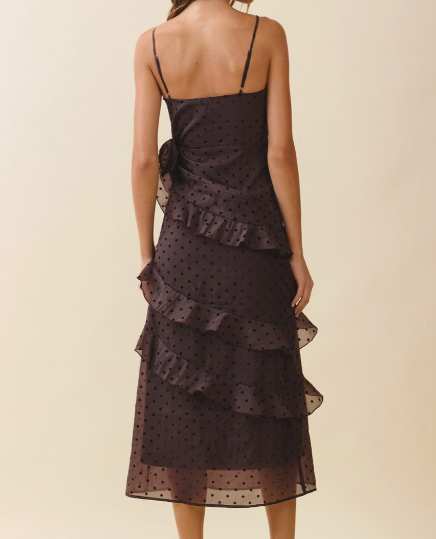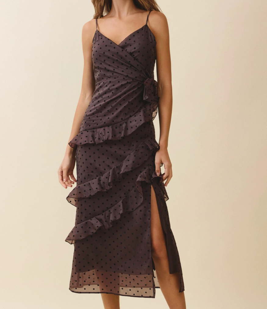 A polka dot mesh midi dress featuring a surplice neckline and cascading ruffle details throughout. Designed with a wrap-style silhouette and an adjustable shoulder straps. Finished with a front slit and side concealed zipper closures.