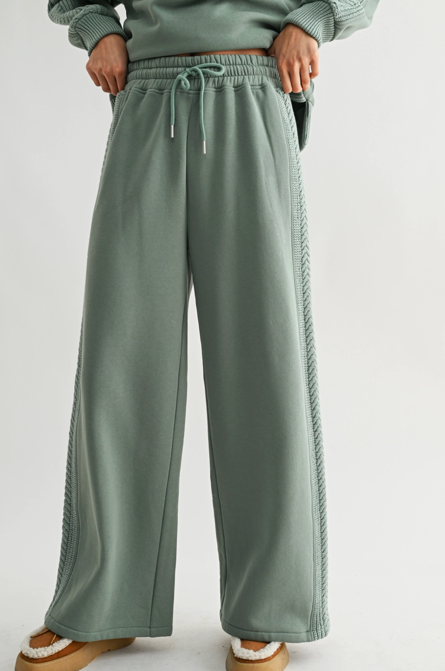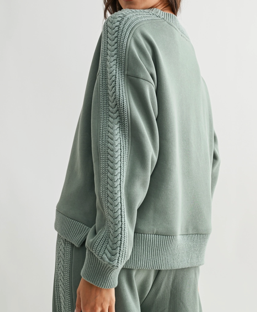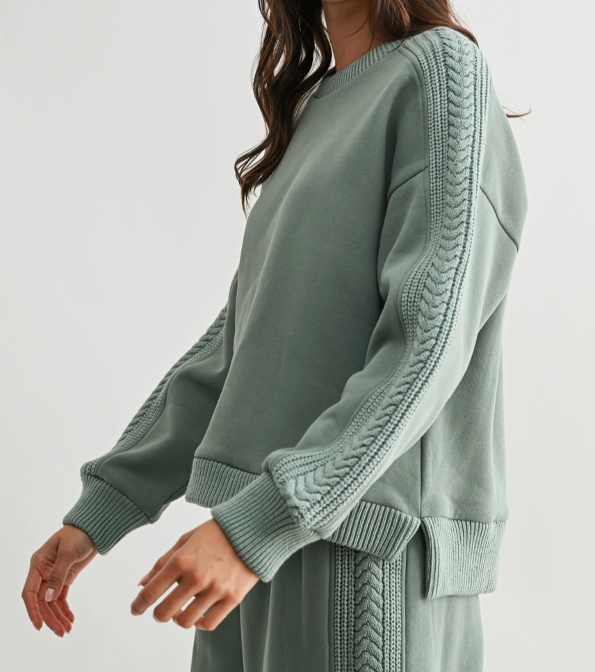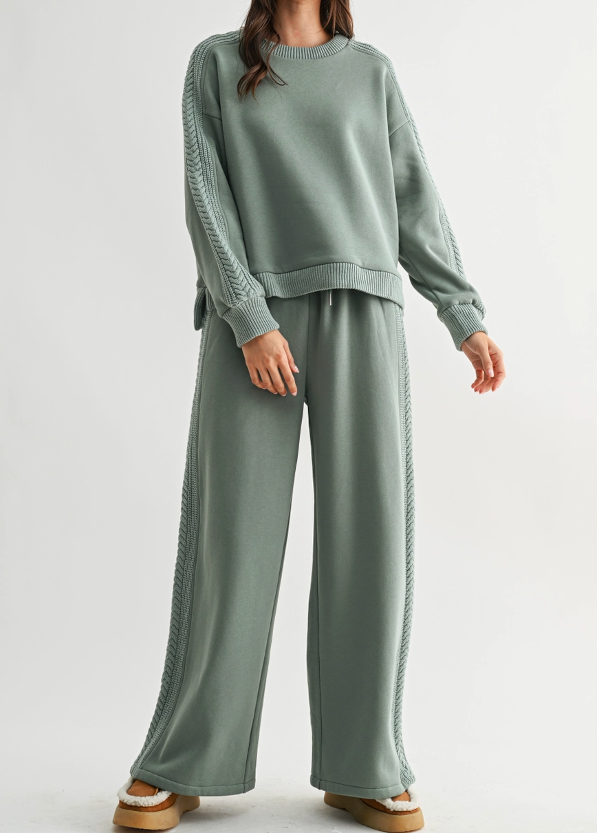 The lounge set of our dreams with a cable knit detail throughout the sleeves and legs. A drawstring waistband with elastic. Set is sold together.